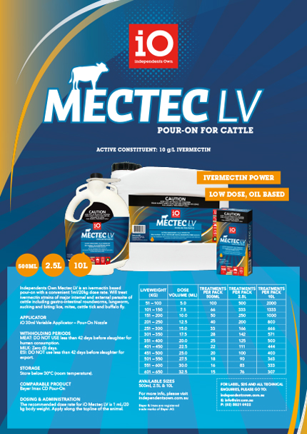 pour-on with a convenient 1ml/20kg dose rate. Will treat ivermectin strains of major internal and external parasite of cattle including gastro-intestinal roundworms, lungworm, sucking and biting lice, mites, cattle tick and buffalo fly.