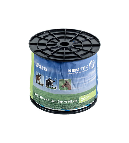 Poly Rope Ultra is a heavy duty rope used for its smooth surface, higher conductivity and superior strength for animal electric fencing. The Poly Rope Ultra Mix 9 range contains highly conductive wires allowing the energizer to power a much longer fence reducing the need for additional energizers.